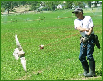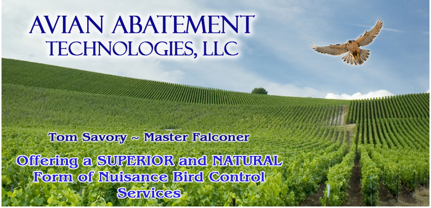 Falcons are trained daily for a year prior to harvest with the objective of teaching the falcons to fly high above crops to scatter nuisance birds. While in the vineyards and farms, just prior to harvest, falcons are released, one at a time, to patrol the skies over the crops. The nuisance birds are dispersed when they see their natural predators, the falcons, in the area.